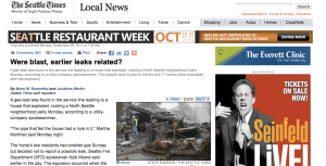 On the Seattle Times, one of the lead articles featured on the home page as of 9:30 a.m. (PDT) Tuesday, Sept. 27, was titled “Were blast, earlier leaks related?.” Its subject was a gas leak in a service line that leads to a house that exploded.