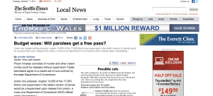 On the Seattle Times, one of the lead articles featured on the home page as of 9:15 a.m. (PDT) Tuesday, Oct. 11, was titled “Budget woes: Will parolees get a free pass?” Its subject was possible effects of drastic cuts outlined by the state Department of Corrections.