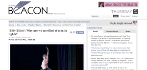 On the St. Louis Beacon, one of the lead articles featured on the home page as of 11 a.m. (PDT) Thursday, Oct. 27, was titled “’Billy Elliot’: Why are we terrified of men in tights?.” Its subject was about “Billy Elliot the Musical” and challenging male gender stereotypes.
