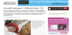 With the world population hitting 7 billion, the UN argued that empowering women is vital to stabilizing growth, as demonstrated in this Christian Science Monitor piece. A baby girl named Danica Camacho born in the Philippines on Oct. 31 became the symbolic seven billionth baby.