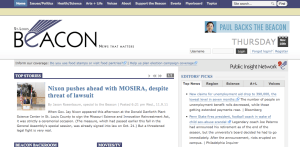 On the St. Louis Beacon, one of the lead articles featured on the home page as of 8:45 a.m. (PST) Thursday, Nov. 10, was titled “Nixon pushes ahead with MOSIRA, despite threat of lawsuit.” Its subject was the governor holding ceremonial signing ceremonies for the Missouri Science and Innovation Reinvestment Act despite the prospect of litigation.