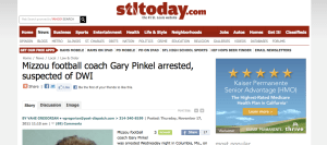 On Stltoday.com, one of the lead articles featured on the home page as of 9:40 a.m. (PST) Thursday, Nov. 17, was titled “Mizzou football coach Gary Pinkel arrested, suspected of DWI.” Its subject was a football coach arrested for suspicion of driving while intoxicated.
