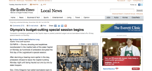 On the Seattle Times, one of the lead articles featured on the home page as of 9:20 a.m. (PST) Tuesday, Nov. 29, was titled “Olympia’s budget-cutting special session begins.” Its subject was disruptions from protesters during the opening of the state legislature’s special session.