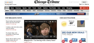 On Chicago Tribune, one of the lead articles featured on the home page as of 7:40 a.m. (PT) Thursday, March 15, was titled “Blagojevich heads for prison: ‘I’m leaving with a heavy heart, a clear conscience’.”