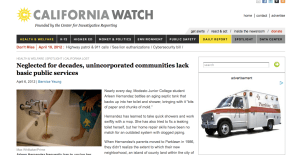 On California Watch, one of the lead articles featured on the home page as of 7:50 a.m. (PT) Tuesday, April 10, was titled “Neglected for decades, unincorporated communities lack basic public services.”